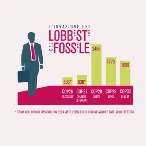 Anche quest’anno i lobbisti dei combustibili fossili hanno ricevuto più pass di tutti i delegati delle 10 nazioni più vulnerabili messe insieme, che sono rappresentate in totale da 1033 delegati. Ancora una volta gli interessi dell’industria fossile hanno più cittadinanza nell’ambito della Cop rispetto ai Paesi che subiscono maggiormente gli impatti della crisi climatica.
