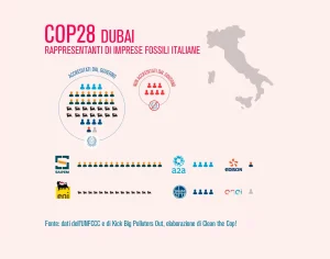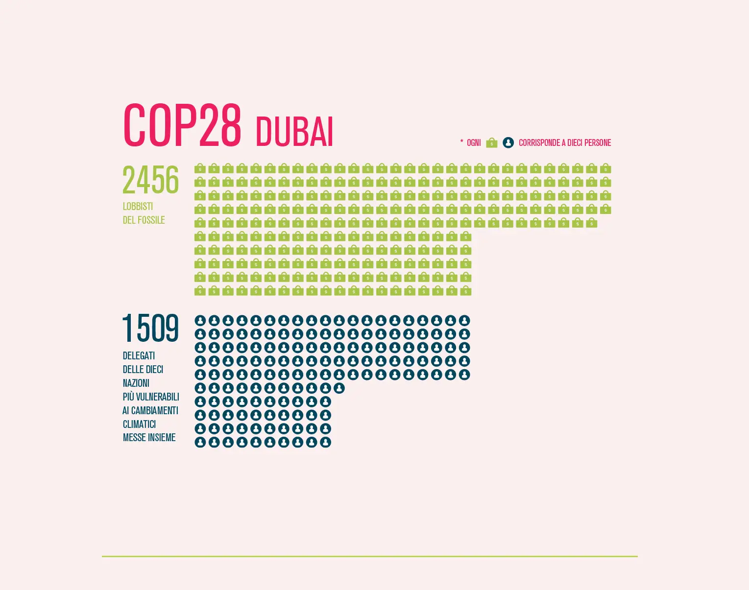 A Dubai i lobbisti dei combustibili fossili registrati sono stati infatti ben 2.456, superando in numero quasi tutte le singole delegazioni nazionali, e di gran lunga le delegazioni delle dieci nazioni più vulnerabili ai cambiamenti climatici messe insieme (1.509).