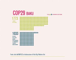 Quest’anno il dato complessivo è di 1773 lobbisti presenti a Baku, superati solo dalle delegazioni inviate dall’Azerbaigian, Paese ospitante (2229), dal Brasile che ospiterà la Cop30 (1914), e dalla Turchia (1862).