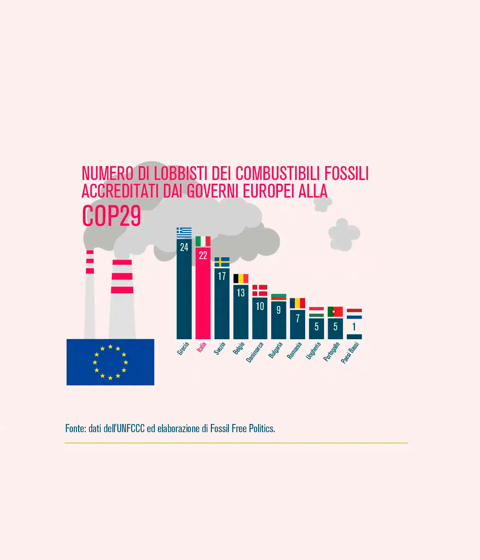 L’Italia risulta uno dei più grandi sponsor europei delle lobby fossili insieme alla Grecia e ha facilitato la presenza di aziende come Eni, Italgas, Edison, Seingim e Confindustria, ma anche Mediterranean Energy and Climate Organisation (OMEC), Tokyo gas e Socar. Non è un caso che proprio Italia e Grecia siano tra i principali acquirenti di gas dall’Azerbaijan tramite il mega-gasdotto Southern Gas Corridor (SGC), di cui l’Unione europea sta attivamente promuovendo l’espansione.