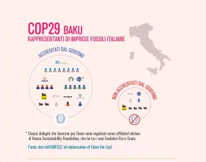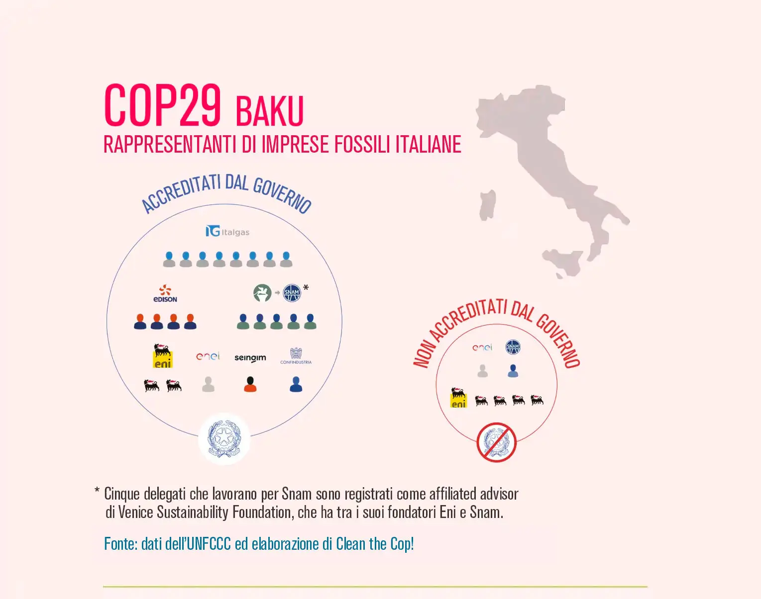 I primi dati disponibili sulla Cop29 di Baku, pubblicati da Fossils Free Politics ed elaborati da Clean the Cop!, contano 22 accrediti concessi dal nostro governo a lobbisti del fossile italiani su un totale di 28. Una presenza ingombrante che rende le Conferenze sul clima occasioni per negoziare accordi per lo sfruttamento di combustibili fossili e non per il loro abbandono. Un esempio? Nei primi giorni di negoziato, come denunciato da ReCommon, Italgas ha siglato un accordo commerciale con l’azera Socar.